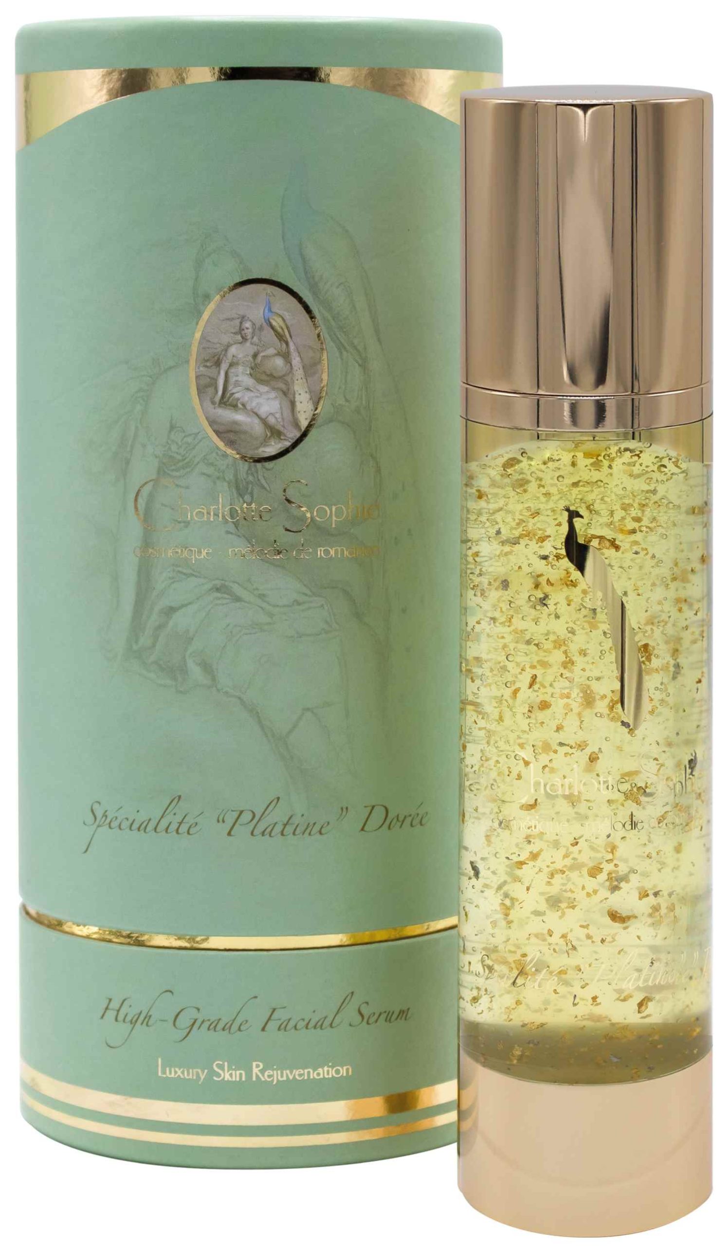 Spécialité Platine Dorée van Charlotte Sophie Cosmétique is een zeer hoogwaardig gezichtsserum, verrijkt met echte kaviaar, en op basis van de edelste der edele metalen: goud én platina, en daarnaast ook oceanisch roodalg-extract. Dit chique, elegante product is geheel in lijn met de extravagante luxe van Charlotte Sophie Cosmétique. Het gezichtsserum is geschikt voor alle huidtypes, en zit in een airless dispenser, waardoor u uw Spécialité-serum makkelijk in uw tas mee kunt nemen.