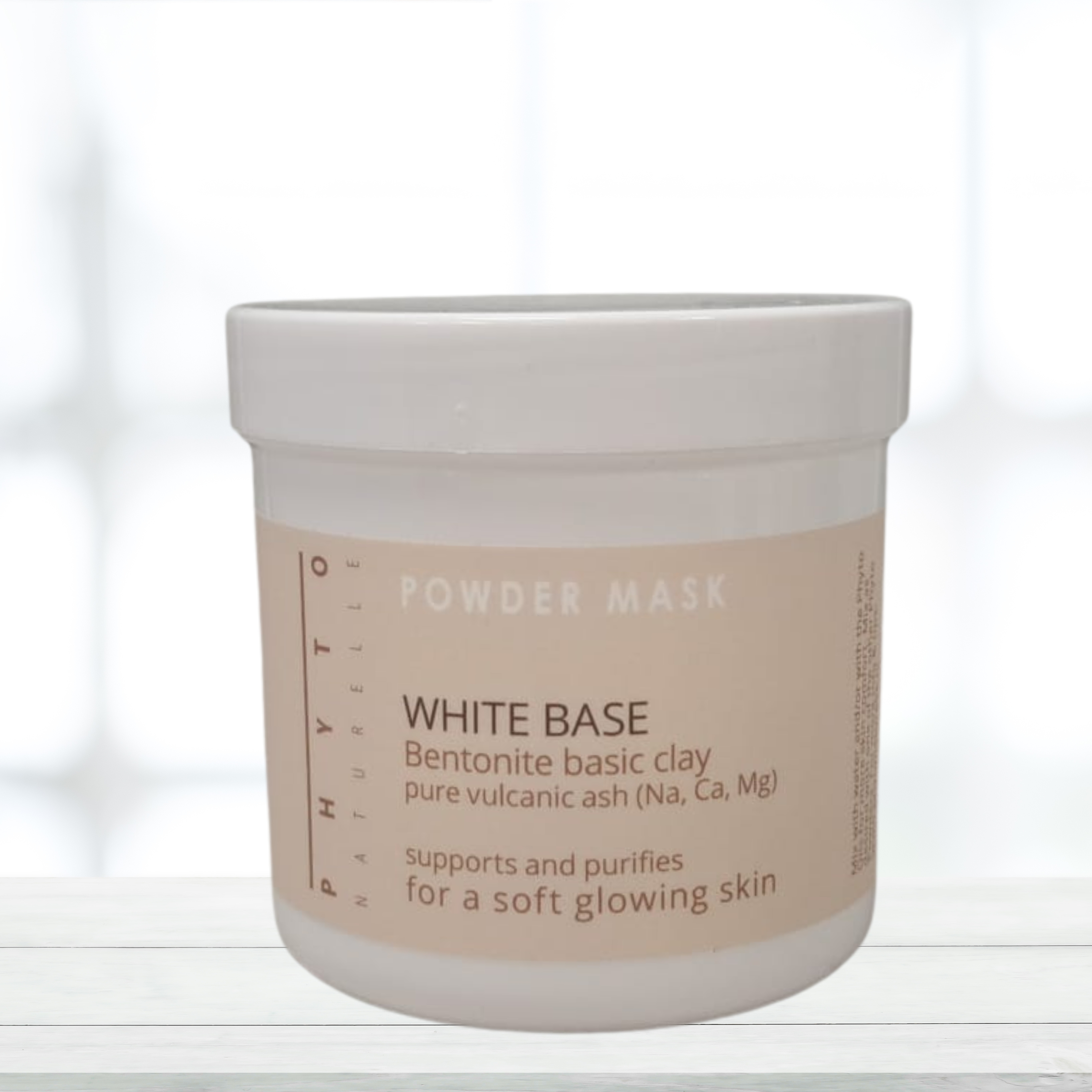 Met de herlancering van de vernieuwde Phyto Naturelle lijn komt er een nieuw maskerconcept, bestaande uit zes natuurlijke poedermaskers: white, green, pink, blue, red en grey. Het Phyto Naturelle Powder Mask White Base is een natuurlijk basispoeder bestaande uit Bentoniet, een pure vulkanische as. Bentoniet poeder bevat chemisch gezien veel waterhoudend aluminiumsilicaat met magnesium en natrium. En een groot deel van bentoniet poeder bestaat uit de stof montmorilloniet. Deze combinatie werkt herstellend en verzachtend bij allerlei huidaandoeningen maar ook als natuurlijk middel om de huid te ontgiften.