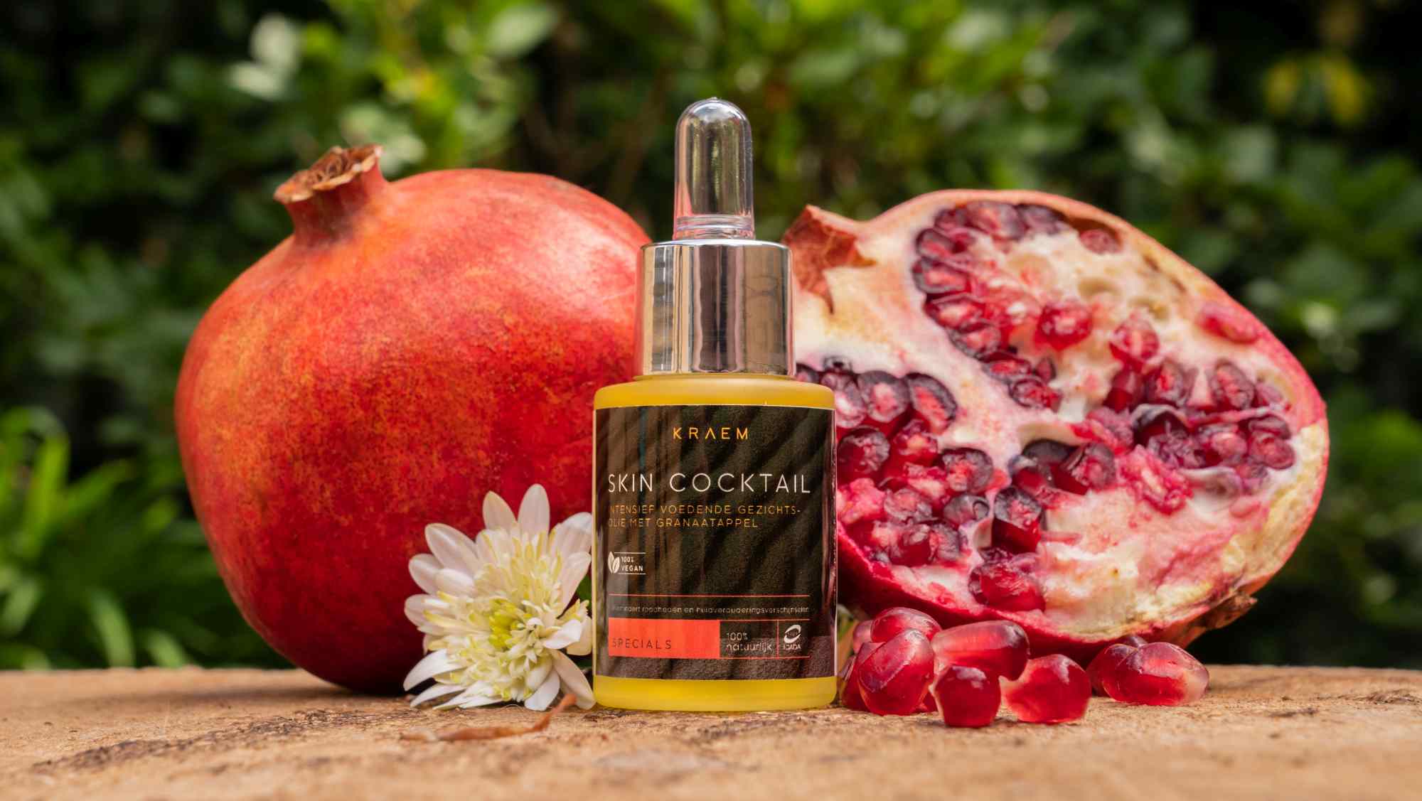 Skin Cocktail van KRAEM is een intensief voedende gezichtsolie die direct versmelt met de huid en een zacht en soepel gevoel geeft. Biologische jojoba olie, sesamolie en abrikozenpitolie voeden en ondersteunen het natuurlijke evenwicht van de huid. Granaatappel extract, rijk aan punicine vetzuur, helpt de huid haar veerkracht te behouden en ondersteunt haar vernieuwingskracht. Dit geeft een krachtig pro-aging effect waarbij de huid steviger aanvoelt en levendig oogt. Arganolie, teunisbloemolie en natuurlijk vitamine E brengen rust bij roodheden en ondersteunen het herstellend vermogen. De lichte textuur voelt comfortabel aan en de subtiele fruitige geur maakt elk moment een zacht ritueel.